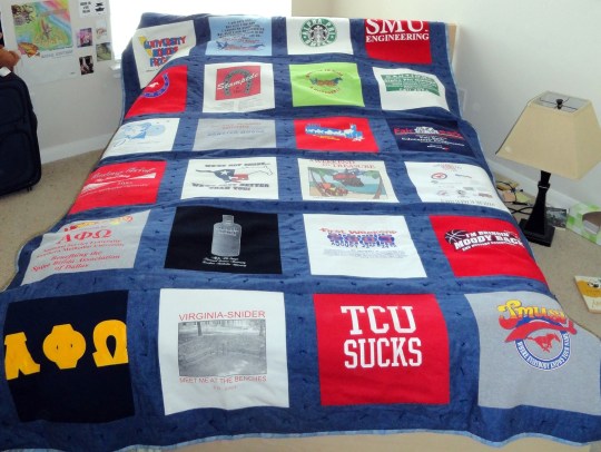 For a graduation gift my mom made me a quilt using t-shirts that I got while going to SMU. When she came around for a visit a few weeks ago she brought me the finished product. I had given her a hard time about finishing the quilt quite a bit (it’s what children are for) … so now I’ll have to find something new to bother her about.