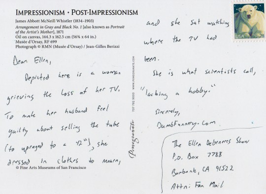 Depicted here is a woman grieving the loss of her TV. To make her husband feel guilty about selling the tube (to upgrade to a 42″), she dressed in clothes to mourn, and she sat watching where the TV had been.