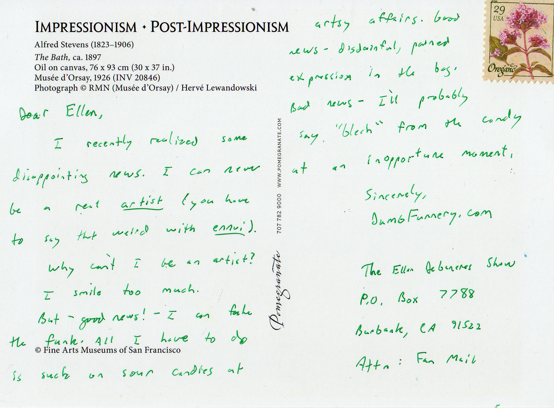 But – good news! – I can fake the funk. All I have to do is suck on sour candies at artsy affairs. Good news – disdainful, pained expression in the bag. Bad news – I’ll probably say “blech” from the candy at an inopportune moment.