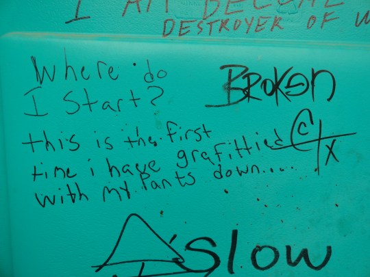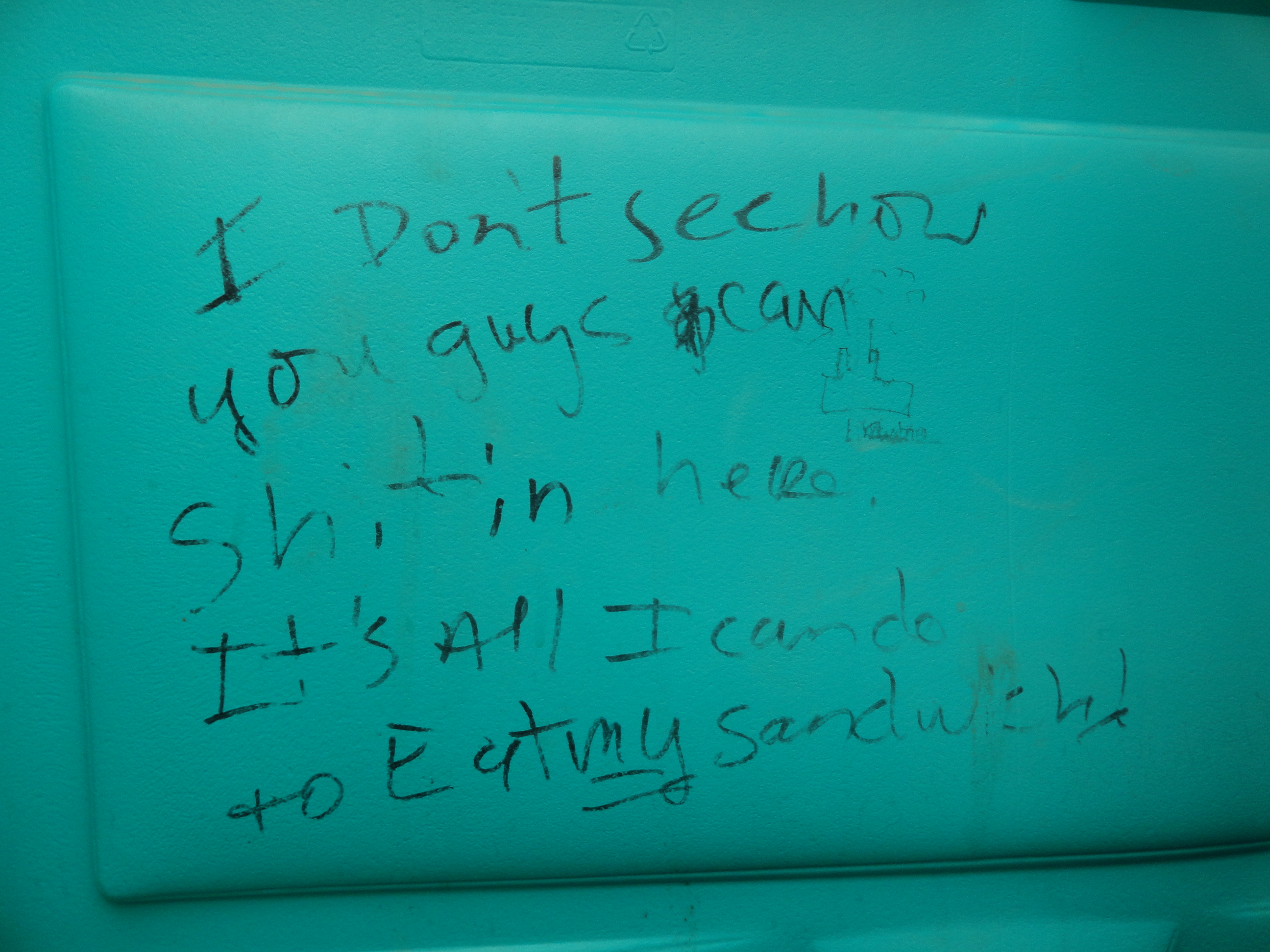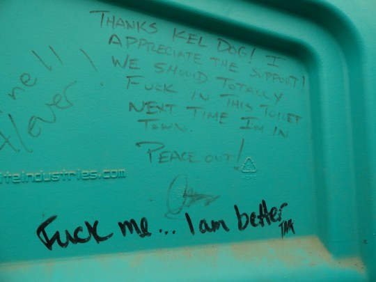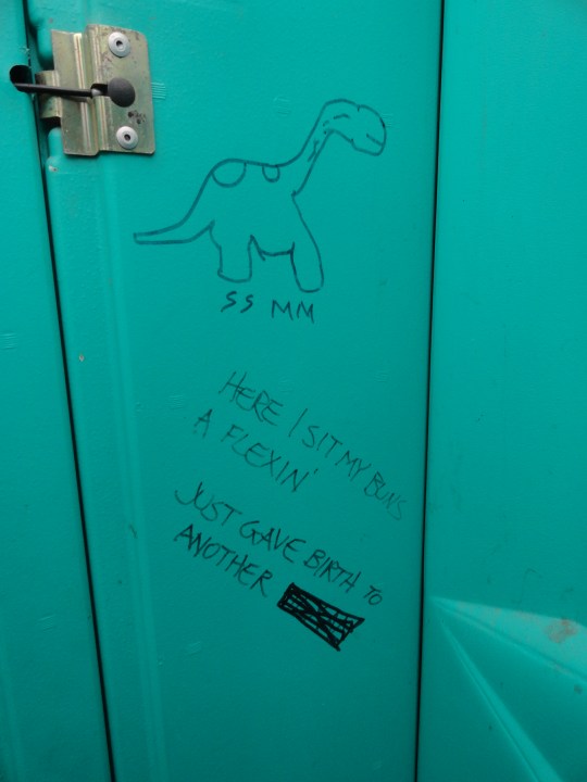Every time I see graffiti in a restroom or portapotty, my first thought is always, “Who ARE these people who always have a marker in their possession?” I mean, seriously, I MIGHT have a pen in my purse. Maybe. But a sharpie? WTF for? Unless you are planning to graffiti a bathroom stall later today. And if that’s the case, how lame is your life?