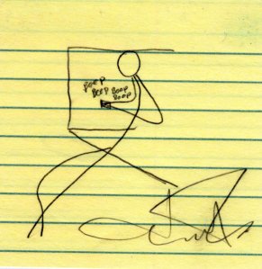 Juicebox, artistic wizard that he is, whipped up this portrait of yours truly (maybe another time I’ll post his dry-erase board art creations). A pretty spot-on picture of me leaning against his cube wall. Over the next two weeks, when I’d stop by to talk, he’d draw another one. They would vary depending on what was going on.