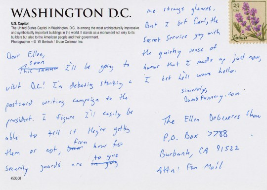 Soon I’ll be going to visit D.C.! I’m debating starting a postcard writing campaign to the president. I figure I’ll easily be able to tell if they’re getting them or not, from how fast security guards are to give me strange glances. But I bet Carl, the Secret Service guy with the quirky sense of humor that I made up just now, I bet he’ll wave hello.