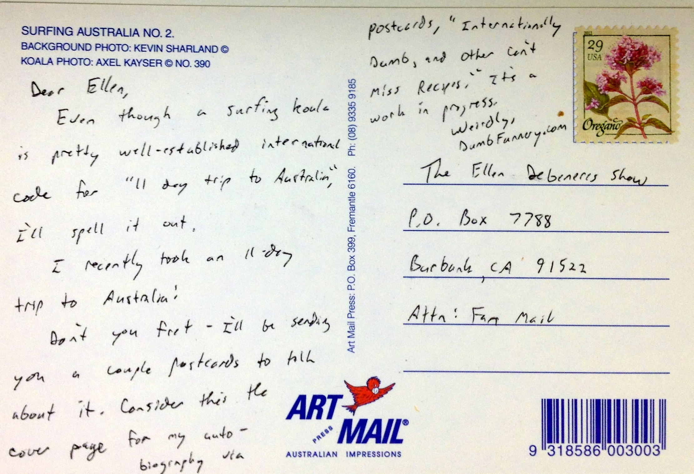 That might just be the best postcard ever. When you write your autobiography, can I do the foreword? I think I have the right tone:
