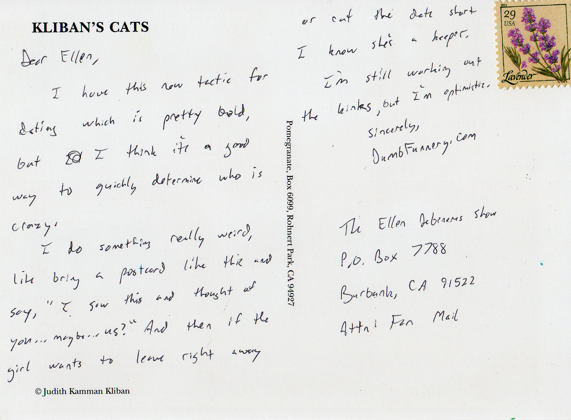 I do something really weird, like bring a postcard like this and say, “I saw this and thought of you … maybe … us?” And then if the girl wants to leave right away or cut the date short I know she’s a keeper.