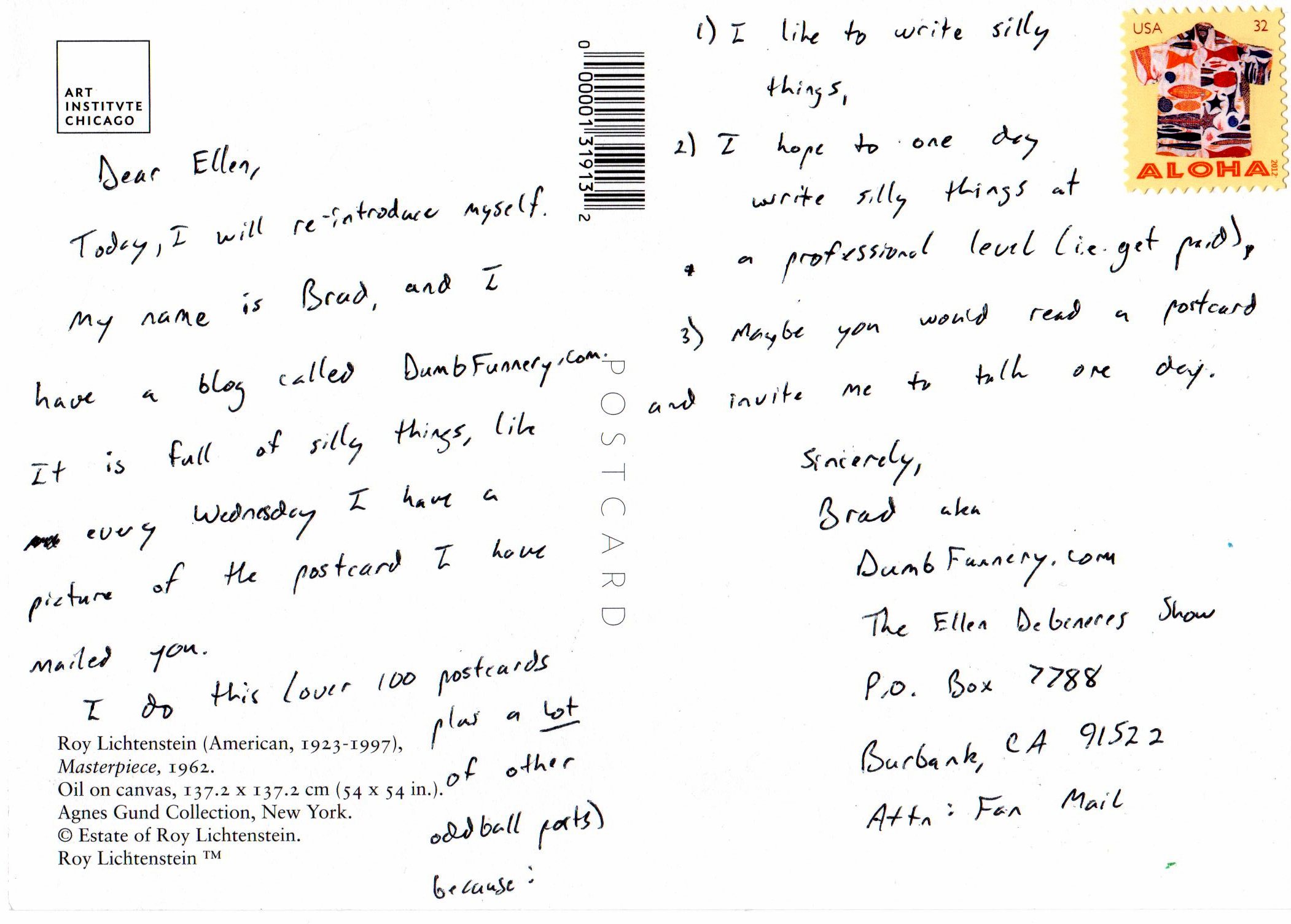 My name is Brad, and I have a blog called DumbFunnery.com. It is full of silly things, like every Wednesday I have a picture of the postcard I have mailed you.