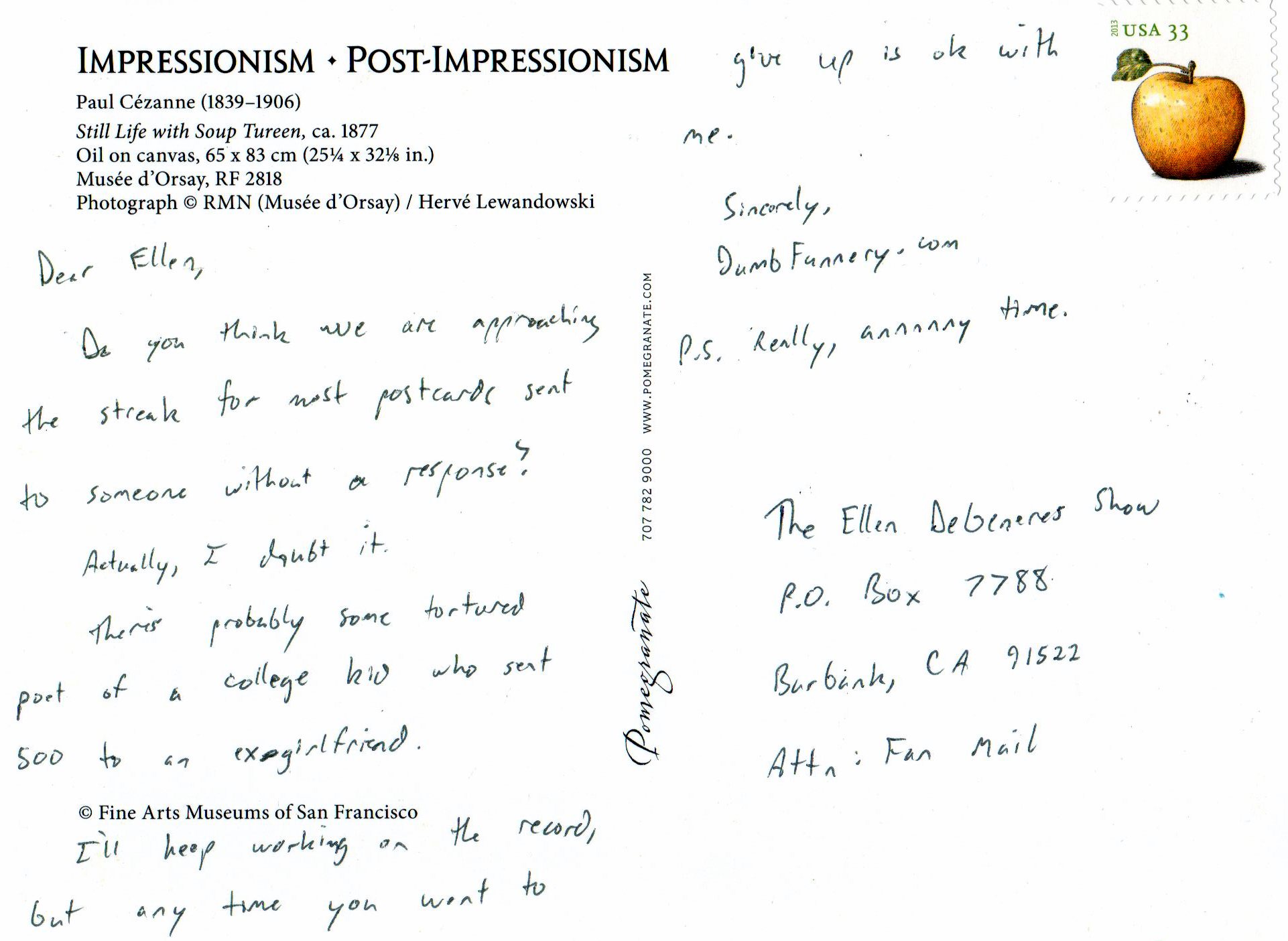 That tortured poet of a college kid who sent 500 to an ex-girlfriend was Forrest Gump. Kinda. I enjoyed this. I’ve never thought about the idea of someone responding to a post card, which raises the question: if Ellen wanted to respond to this, would she write to Paul Cezanne???