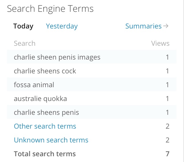 I’m not sure when it started, because I only recently started looking at the search terms that led to my blog on a somewhat-regular basis. But here are the results, as of today: