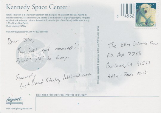 [P.S. I realized after I wrote this that I sent another of the SAME(ish) postcard … this one I bought at Kennedy Space Center. The other one I bought at Johnson Space Center. Anyway – the joke is so dumb that I find it funny. My sincere apologies for the repeat(ish) postcard, Ellen.]